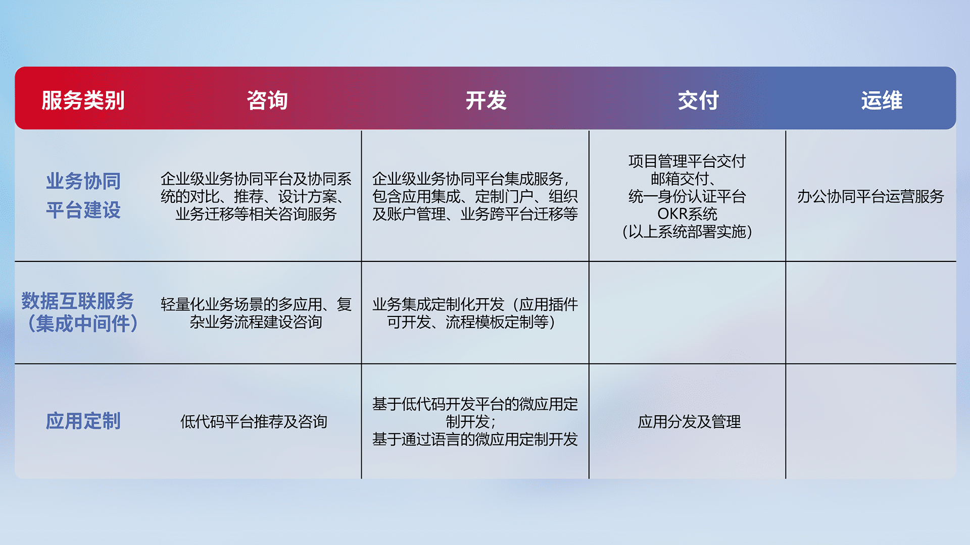 针对钉钉、、、企微、、、、IDaas等平台级产品提供产品的规划、、、方案、、、、交付、、定制化开发等服务,,,实现如统一协同办公、、智能客户服务、、混合会议管理、、智能数据查询、、、、等业务场景,,实现数字化转型。。。。